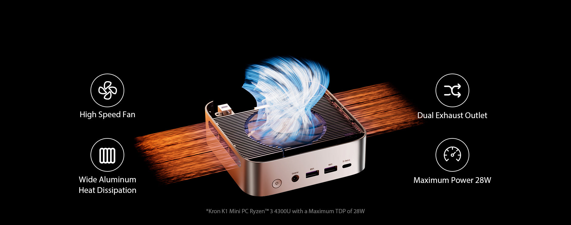 High-speed fan and dual exhaust design ensure efficient cooling