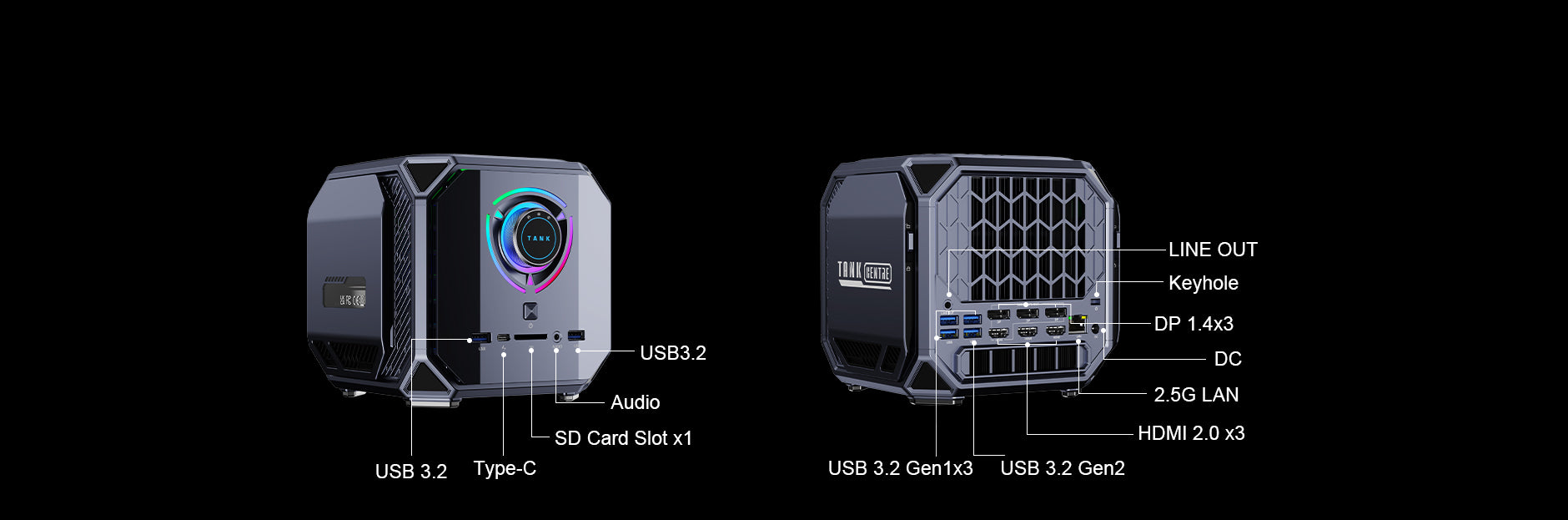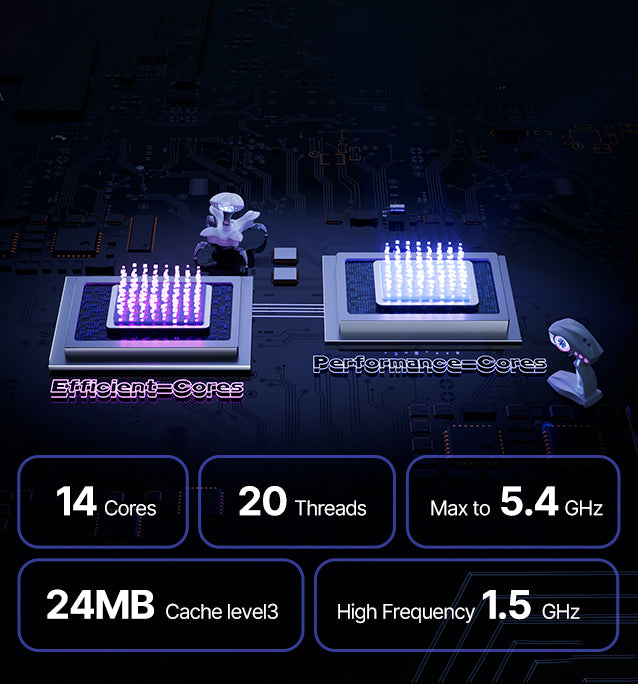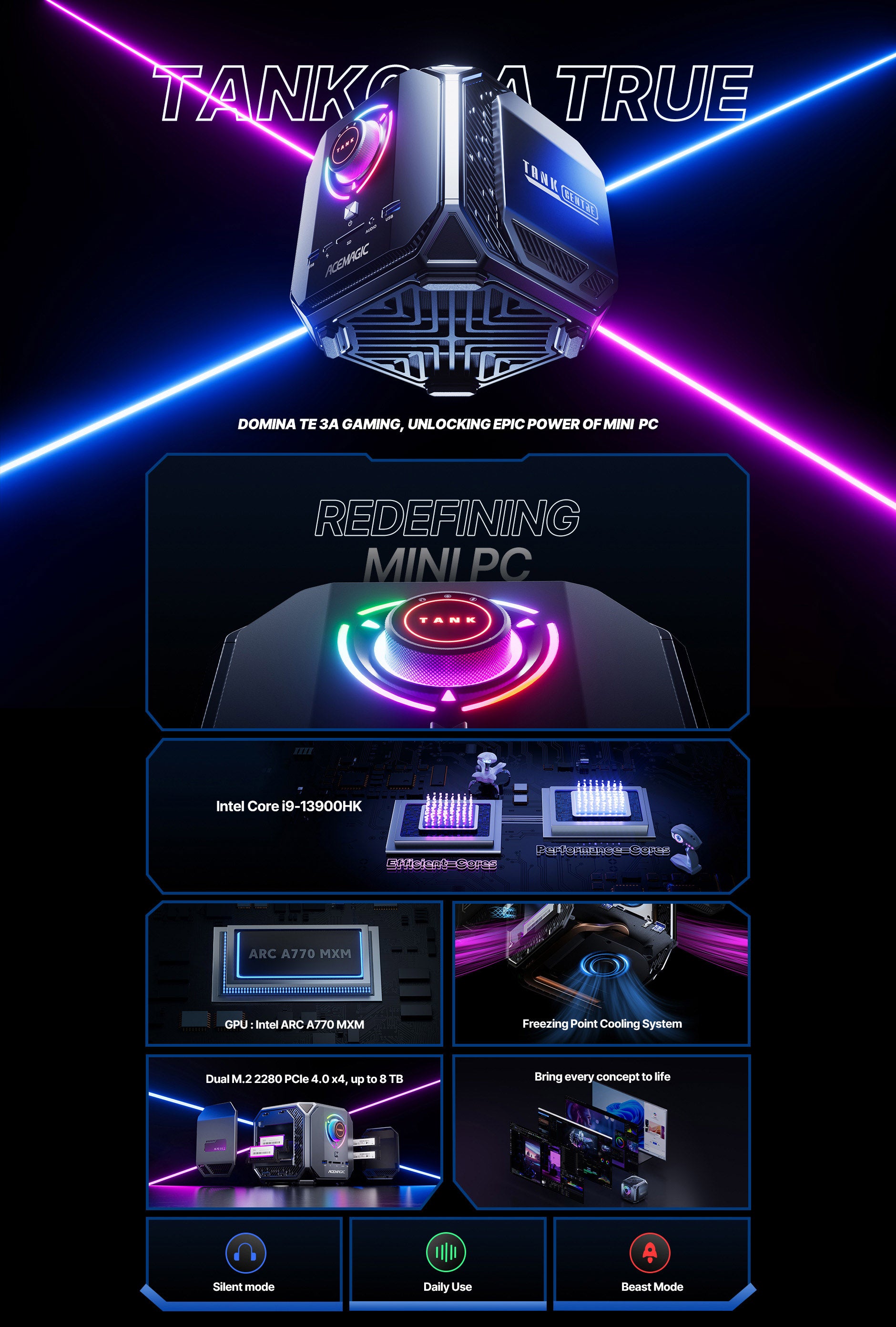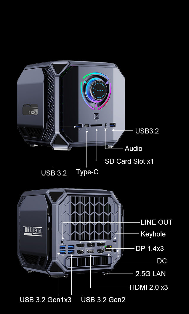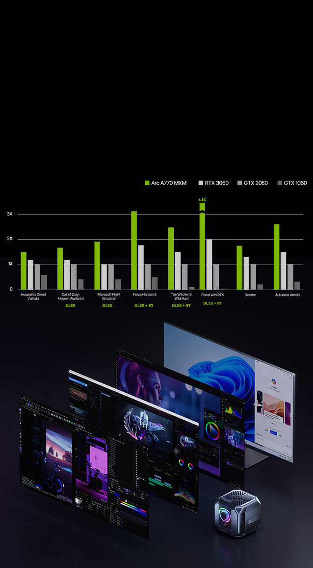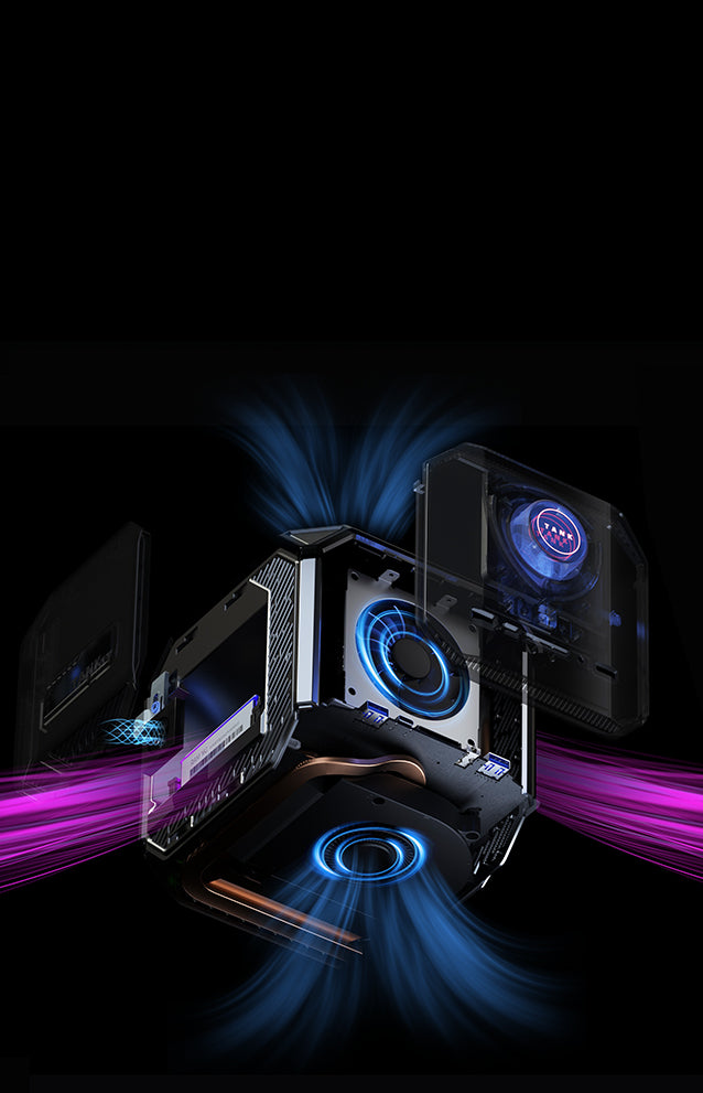 The world's first AAA Sci-Fi Games Mini PC. 12TH Generation Intel Core i9 12900H, Cores14 Threads 20, 5.0GHz maximum RWD 24MB Cache level3 High Frequency 1.45GHZ. NVIDIA GeForce RTX 3080M 16GB GDDR6 memory Break Limits with Revolutionary 4D Cooling System. Smart Control Center Awaken Epic Energy....